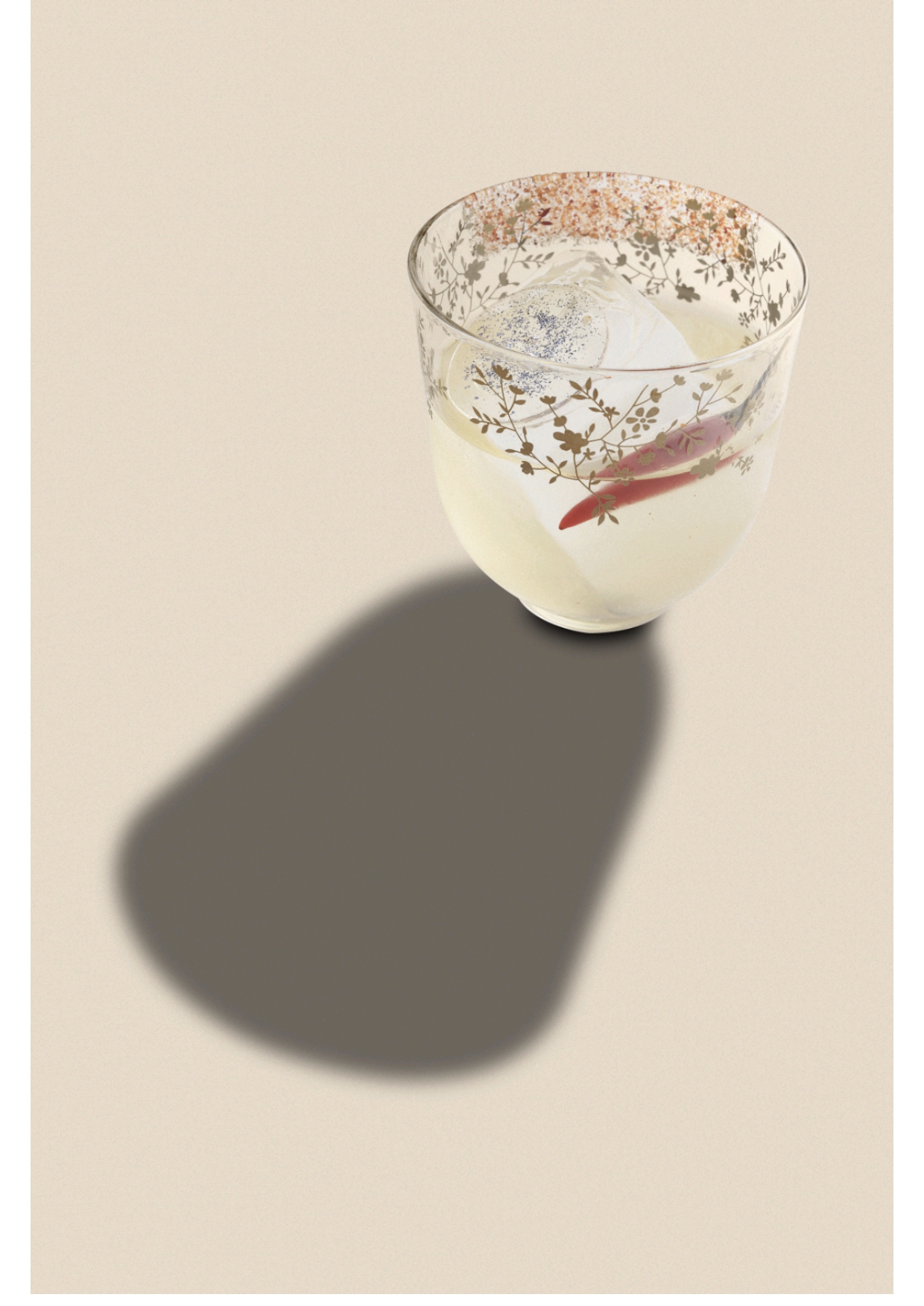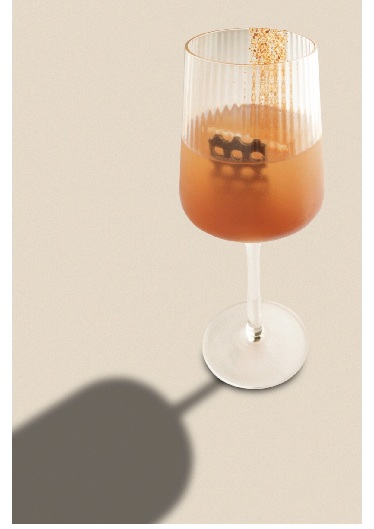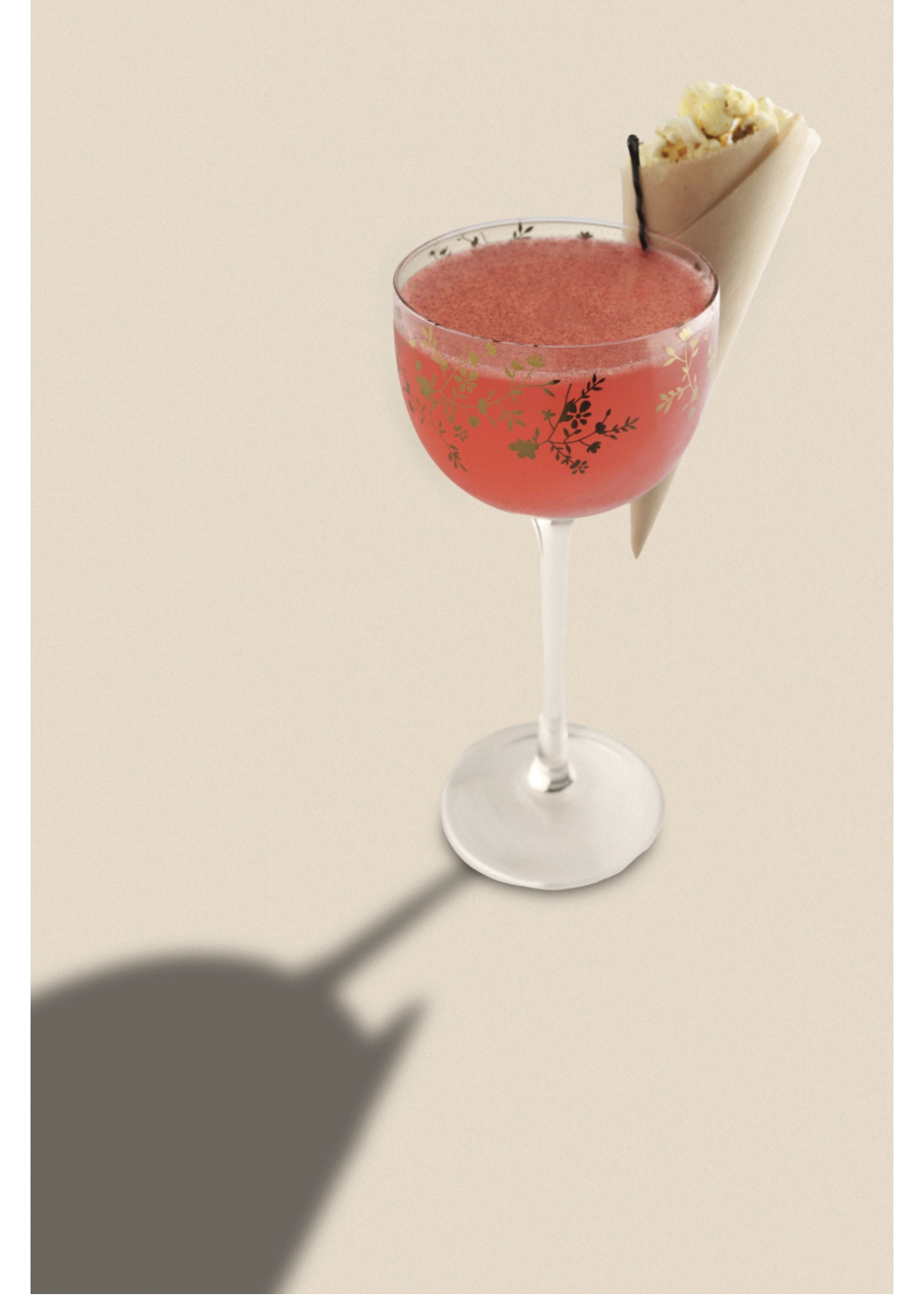 Corn Infused Vodka, Campari, Lime Juice, Agave Syrup, Roasted Popcorn, Edible Red Glitter