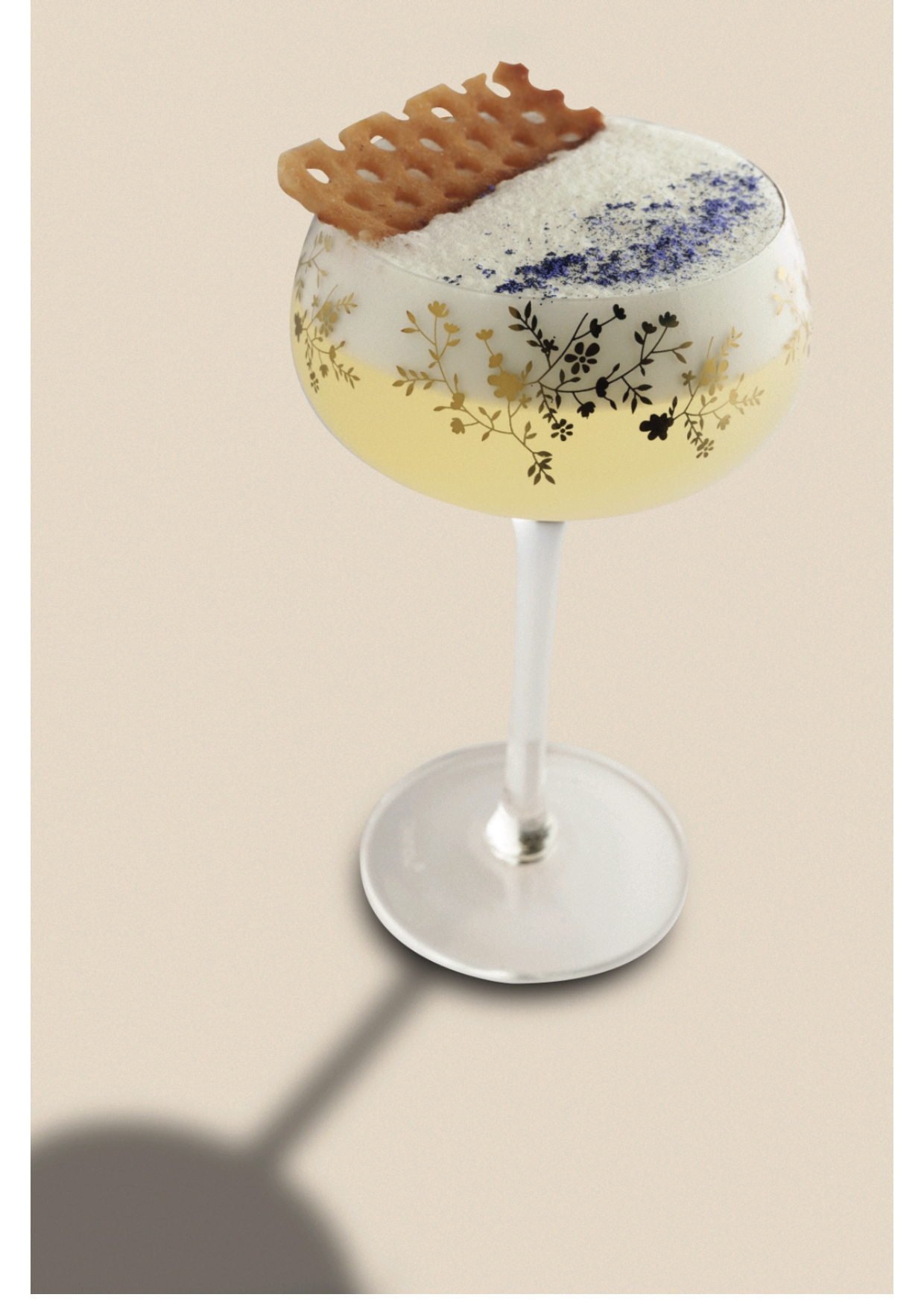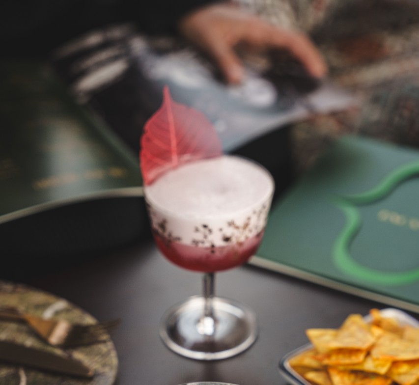 Pomegranate Juice, Lavender Syrup, Egg White, Lime, Agave Syrup.